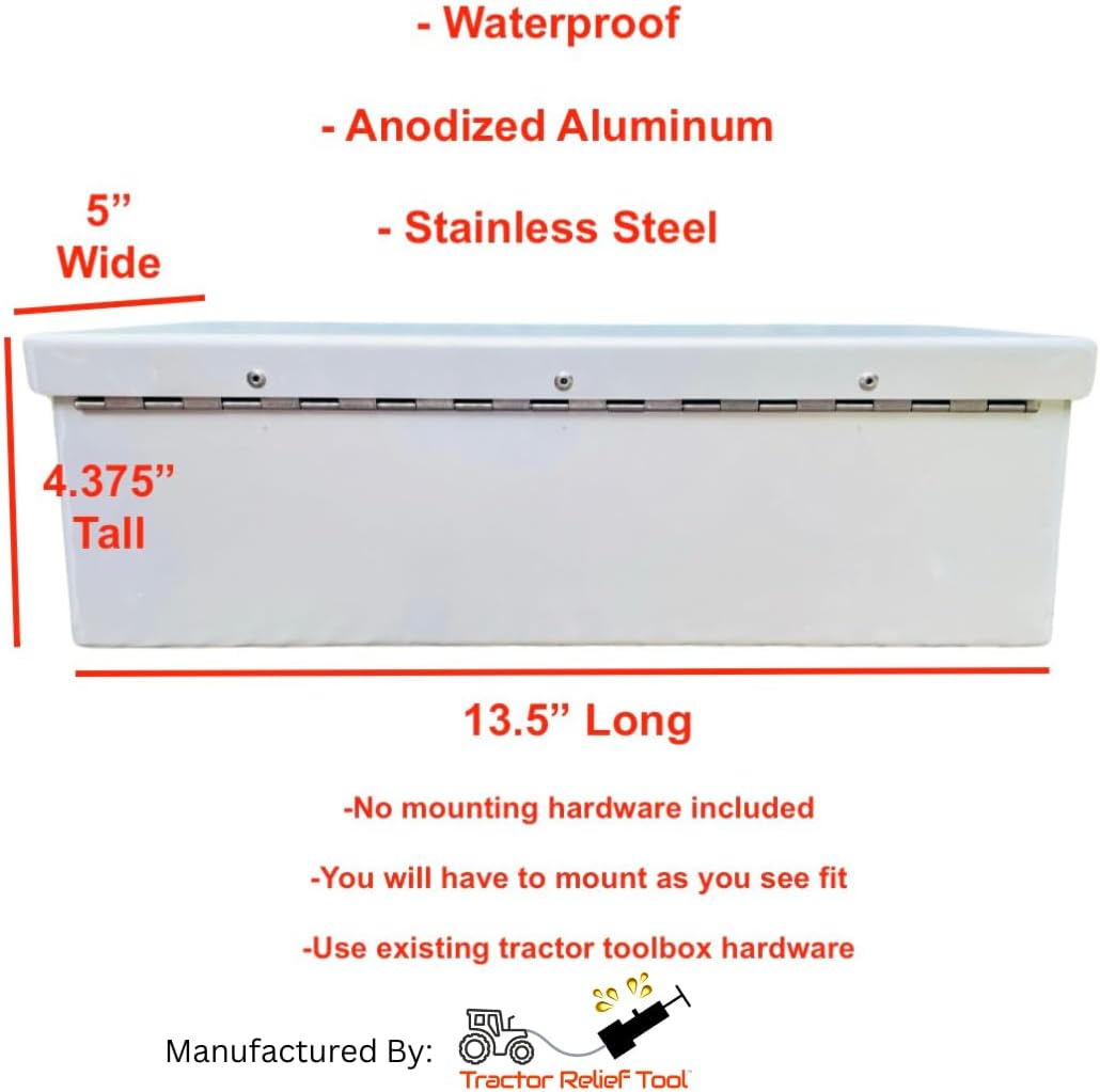 Frustrated by the tractor tool box options on the market, we set out to design a quality one! We succeeded! The highest quality Tractor Tool box on the market! Our anodized aluminum tool box is meant to replace the cheap metal or plastic tool boxes that come stock mounted on Kubota tractors, as well as many others. Built by a tractor owner who wanted a quality tractor tool box that can withstand the elements and last a lifetime. Constructed of anodized aluminum with stainless steel components, the box is sturdy and weatherproof to withstand the elements. It is universal and can be mounted on any tractor. Bolt it on and go! Capacity to fit all the hammers, pliers, pins you need to carry on your tractor. Size: 4.25" Tall x 5" Deep x 13.75" Long Exterior Dimensions